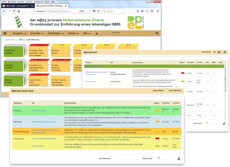 Alle Ziele werden über die Prozessmatrix den betreffenden Prozessen, mit allen dazugehörigen Informationen, zugewiesen. Sich beeinflussende Ziele können damit miteinander verbunden werden. Neben einer allgemeinen Übersicht aller Ziele, können eigene Kategorien für die Erstellung einer Balanced Scorecard definiert werden.