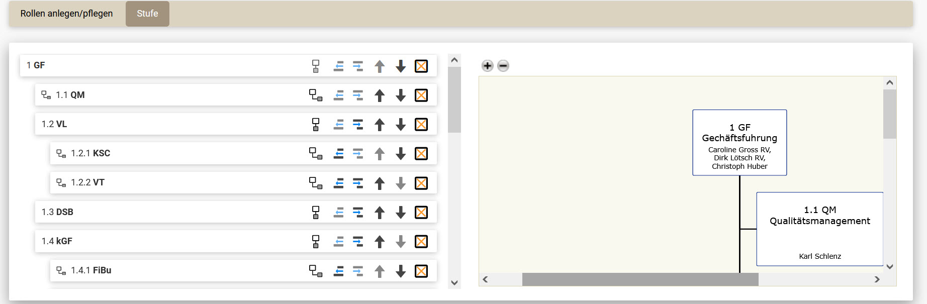 Mit der Anzahl der Rollen und Funktionen innerhalb des Prozessmodells ist es erforderlich, das Zusammenspiel über ein Organigramm abzubilden. Über die Verwaltung der Rollen innerhalb von e@sy process und die Einarbeitung unterschiedlicher Organigrammstufen können Sie für unterschiedliche Organisationen ein Organigramm erstellen.